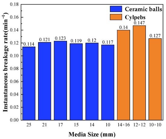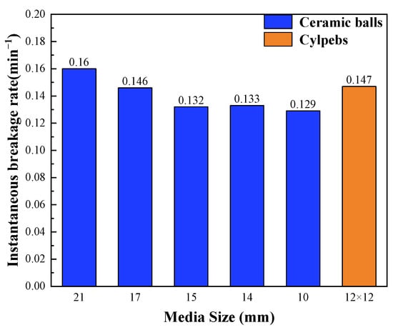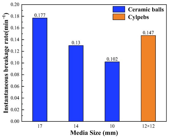 In order to deeply investigate the differences in the fine-grinding performance between ceramic balls and cylpebs, batch grinding tests using ceramic balls with the same total mass as 12 × 12 mm cylpebs were conducted. The instantaneous specific breakage rates of the ground products are shown in Figure 6.
