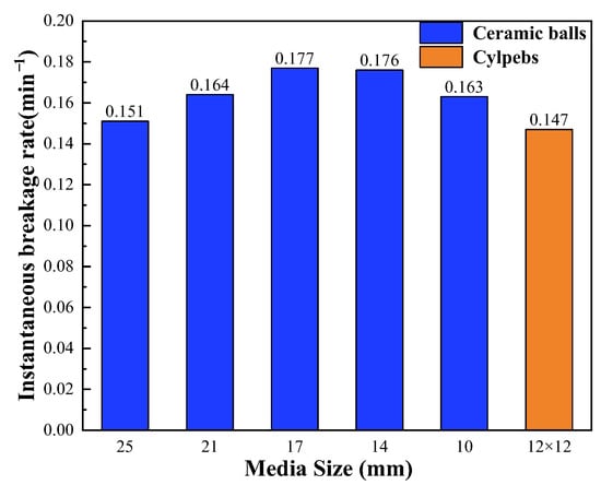 Compared with 12 × 12 mm cylpebs, 17 mm ceramic balls have the same single mass, total number of grinding media, and total mass, but a larger total surface area. As illustrated in Figure 6, the instantaneous breakage rate (0.177 min−1) of 17 mm ceramic balls is larger than that (0.147 min−1) of 12 × 12 mm cylpebs. This may reflect the fact that ceramic balls have a larger total surface area than cylpebs, which is beneficial to fine grinding with the same total charge mass and same total number of charges.