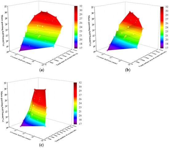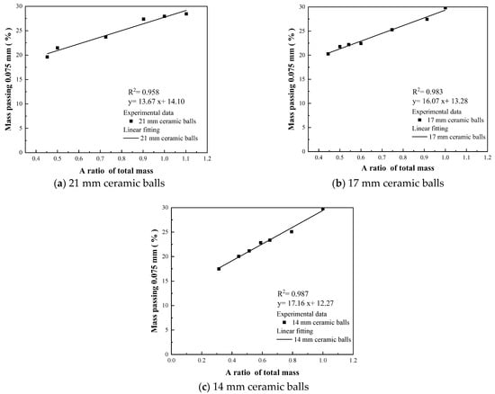 As shown in Figure 10a, when the distribution of the percentage passing 0.075 mm of 21 mm ceramic balls is the same as that of 12 × 12 mm cylpebs (25.41%), the total mass of the 21 mm ceramic balls is only 0.83 times that of the 12 × 12 mm cylpebs. In Figure 10b, when the distribution of the percentage passing 0.075 mm of the 17 mm ceramic balls is the same as that of the 12 × 12 mm cylpebs (25.41%), the total mass of the 17 mm ceramic balls is only 0.76 times that of the 12 × 12 mm cylpebs. Moreover, in Figure 10c, when the distribution of the percentage passing 0.075 mm of the 14 mm ceramic balls is the same as that of the 12 × 12 mm cylpebs (25.41%), the total mass of the 14 mm ceramic balls is only 0.77 times that of the 12 × 12 mm cylpebs.