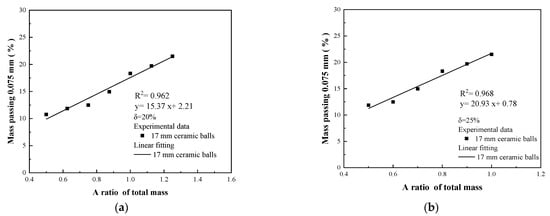 In Section 4.1 and Section 4.5, it is shown that 14–21 mm ceramic balls and 12 × 12 mm cylpebs have better performances of the fine-grinding process. However, because the bulk specific gravity of ceramic balls is only 0.5 times that of cylpebs, the fine-grinding performance of ceramic balls is inferior to that of cylpebs at the same charge volume. In order to yield the same fine-grinding performance achieved by cylpebs in the wet ball mill, we proposed a method using ceramic balls instead of cylpebs under the premise that the ceramic balls would reach a certain total mass and size. The relationship between the distribution of the percentage passing 0.075 mm and the ratio of the total mass of cylpebs can be defined as follows: