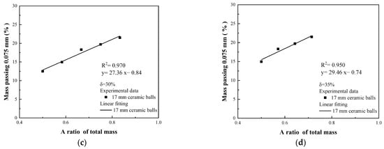 The relationship of the distribution of the percentage passing 0.075 mm in the ground product and the ratio of the total mass of 12 × 12 mm cylpebs in a wider charge volume: (a) δ= 20%; (b) δ= 25%; (c) δ = 30%; (d) δ = 35%.