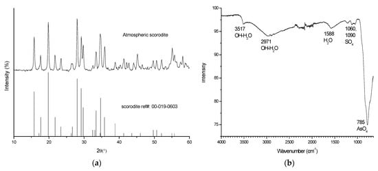 XRD (a) and FTIR (b) spectra of the atmospherically precipitated scorodite.