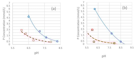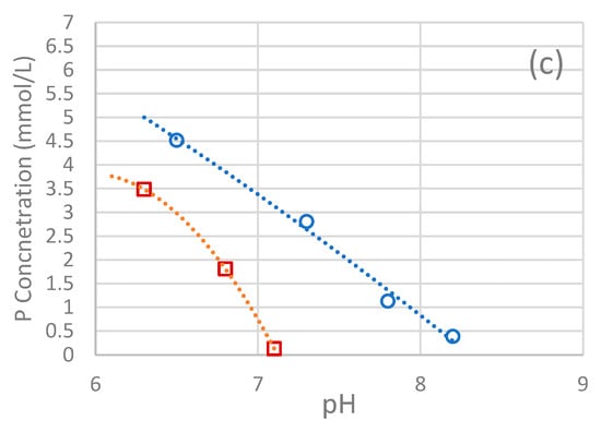 Additionally, the knowledge of the metastable zone width of HAP and FAP was essential to designing the precipitation experiments to favor heterogeneous nucleation instead of homogeneous nucleation. The metastable zones of the apatite precipitation compounds defined in terms of phosphorus concentration (concentration vs. pH) are presented in Figure 3. Based on these curves, the direct deposition of HAP/FAP on scorodite was attempted at either pH 7.6 with a starting P concentration of 0.9 mmol/L but not exceeding 1.2 mmol/L during the experiments, or at pH 7.0, with a starting P concentration of 2 mmol/L but not exceeding 2.5 mmol/L during the experiments. As depicted, the zones for HAP and FAP are similar, however, fluorapatite tends to precipitate in advance at a lower pH value for the same phosphorus concentration. Therefore, the conditions for FAP deposition experiments were kept as those used for HAP using three feed solutions, in this case, namely NaH2PO4 30 mmol/L, CaCl2 50 mmol/L and NaF 10 mmol/L.