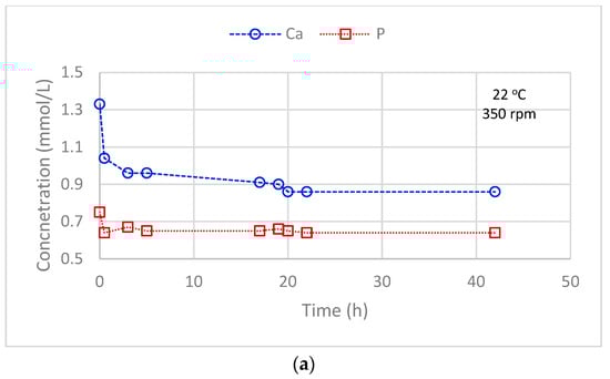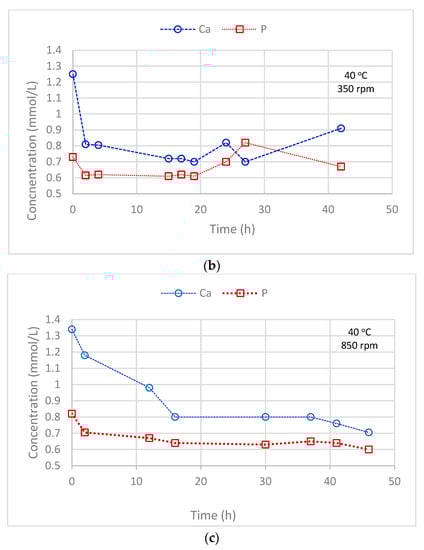 P and Ca concentrations as a function of time during three nucleation experiments at (a) 22 °C and 350 rpm, (b) 40 °C and 350 rpm and (c) 40 °C and 850 rpm.