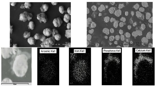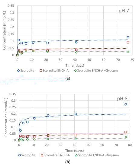 Recently, Das and Mandal [25] found high As concentrations (from 28.9 to 143 mg/L) in shallow aquifers (<50 m) with a reductive environment in West Bengal, India, as well as in sediments. Reductive conditions (low Eh) may prevail in cases where the deposition of hazardous solid wastes, as in the case of scorodite, is sub-aqueous with the presence of soluble organic carbon or at depths of approximately 2 m below the ground in an anaerobic environment, where reactive metal sulfides may act as a reducing agent [16]. Then, the encapsulation of scorodite with stable compounds may prevent contamination with the release of arsenic into the environment, both in anoxic and oxic conditions.