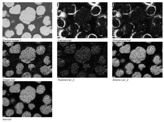 As can be verified with the data in Table 1, the FAP-encapsulated scorodite (obtained with the encapsulation D method) was released after 20 days, under oxic conditions and pH 9.0, with three times less arsenic, 0.089 mmol/L (6.67 mg/L) than the unprotected scorodite, 0.27 mmol/L (20 mg/L), and seven times less under an anoxic condition in 6 days (76 mg/L versus 10 mg/L). Thus, it is deduced that the fluorapatite layer effectively coated the surface of scorodite, and the observation is consistent with the elemental mapping shown in Figure 9.