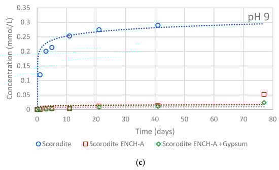 As release in oxic stability tests at (a) pH 7, (b) pH 8 and (c) pH 9 from naked scorodite and scorodite coated with HAP according to encapsulation method A in gypsum-free (ENCH-A) and gypsum-saturated water (ENCH A+Gypsum) at 22 °C.
