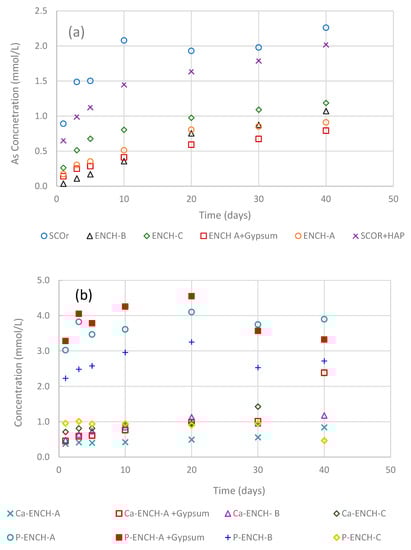 The results in anoxic conditions are plotted in Figure 9. After 20 days, in general, the release levels were stabilized, signaling near pseudo-equilibrium attainment. In an anoxic environment of 150 ± 40 mV, the naked scorodite sample was found to release 2.3 mmol/L As. Encapsulation A and B produced a scorodite@HAP that releases 60% less arsenic than the naked scorodite. These procedures were slightly better protected than ENCH-C, since the arsenic release at pH 8 was ~0.9 mmol/L for ENCH-A and ENCH-B versus 1.2 mmol/L As for ENCH-C. At pH 9.0, ENCH-A yielded a 30% decrease in As release, from ~1.3 mmol/L (110 mg/L) to 0.395 mmol/L (30 mg/L).