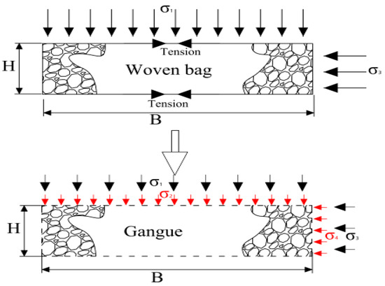 T is the tensile strength of the gangue bag, kN/m; H is the thickness of the gangue bag, m; B is the length of the gangue bag, m; , where E is the modulus of elasticity, is the increment of circumference, and is the circumference.