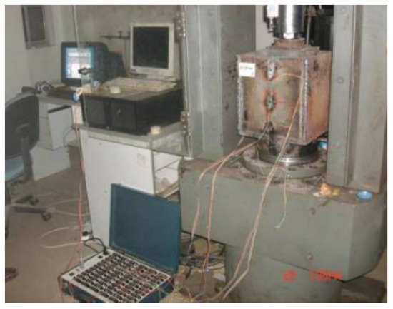 The uniaxial compression test for macro scale flexible material (coal gangue) packing body was performed using a conventional single-axis press. The dimensions of the macro-scale pressure cell were 300 mm × 300 mm × 300 mm, the maximum pressure was 5.5 MPa, the loading rate was 2 mm/min, and the measurement range of the load transducer was 500 kN. Though there was a load transducer in the laboratory whose measurement range is 2500 kN, for a test piece with cross section of 300 mm × 300 mm, the load transducer with a measurement range 500 kN was the most appropriate and ensured high-precision results. The specific experimental site is shown in Figure 4.