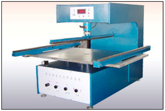 An overall digital closed-loop control, equal-rate displacement control, and constant test force control in the test process were realized by adopting the DOLI EDC controller and the MOOG direct-acting proportional servo valve and combining them with a computer for a control measurement system. The bagged gangue compression adopts a trolley-type plate structure; the plate size was 750 mm × 500 mm, and the thickness was 35 mm. During the experiment, the bagged gangue was placed in the center of the pressure plate, and the load was applied slowly and evenly; when the pressure head is compressed under the uniaxial press, the load and the corresponding strain value were recorded. The experiment ended when the load reached 5.5 MPa, and the test piece was replaced, as shown in Figure 3.
