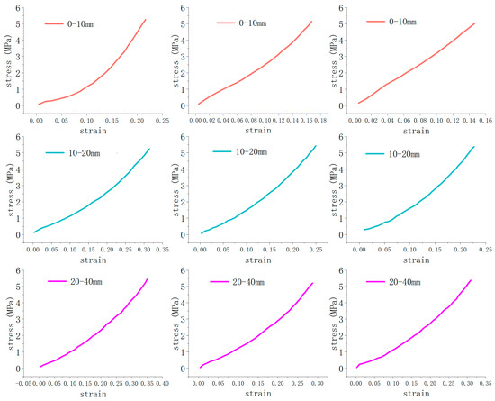 Due to the limitations of laboratory equipment and test conditions and some idealized factors in theoretical study, it is impossible to conduct a holistic study based on actual mining height, nor to conduct quantitative and qualitative analysis of the support resistance provided by the backfilling wall of flexible material (coal gangue). However, coal gangues in the flexible material packing body are under fixed lateral constraints whether they are packaged or not. Coal gangues packing could ensure a better uniformity and effectiveness of the lateral constraint within the flexible material packing body. The resulting axial stress–strain relationship for particles in 0–10 mm, 10–20 mmm and 20–40 mm size fractions is shown in Figure 8.