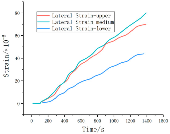 Strain gauges were installed on the front and back of the pressure cell to analyze the lateral strain and axial strain of the pressure cell under pressure. The specific results are shown in Figure 9 and Figure 10.