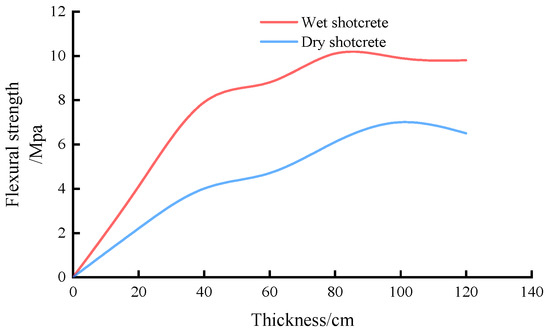 It can be seen from the figure above that the flexural strength of both dry and wet shotcrete increased with the increase of thickness. When the thickness of dry shotcrete reached 100 mm, its flexural strength hardly increased. Wet shotcrete thickness reached 60 mm, and its flexural strength increase was very slow, and the thickness of the wet shotcrete reached 60 mm flexural strength and dry shotcrete thickness was 100 mm when the flexural strength was almost equal, so when the roadway support is against the folding strength requirement phase at the same time, adopting the wet shotcrete support can reduce the spray layer thickness, maintaining the flexibility of the spraying layer and also saving materials.
