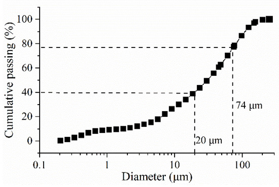 Natural iron ore tailing was used as aggregate, which was obtained from a mineral processing plant in Fujian Province, China. Thickened tailings was dried at 60 °C in a dry chamber to remove the free water completely. Then, the dry agglomeration was destroyed with a pestle. The grain size distribution of the tailings was analyzed through Mastersizer 2000 laser diffraction (Malvern, UK), and the result is shown in Figure 1. It can be seen that the percentage of particles finer than 20 μm is 39.6%, and the tailings could be classified as medium tailings. The particles finer than 75 μm are 77.4 wt.%. Some chemical and physical properties of the tailings are shown in Table 1 and Table 2.