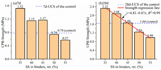 The 28-day UCS of the CPB declines linearly from 2.32 MPa to 0.99 MPa as the SS dosage rises from 35 wt.% to 55 wt.%. The negative linear relation is regressed in the following Equation (1).