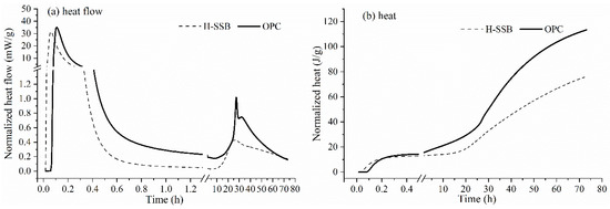 Figure 4 shows the hydration heat evolution of the H-SSB within 72 h. Overall, the H-SSB has a similar hydration heat curve as OPC, which can be divided into five stages initial mixing reaction, dormancy, strength acceleration, speed reduction, and steady development [37]. However, the H-SSB has low hydration heat generation than the OPC (78 J/G vs. 113 J/G), which can reduce the thermal stress in the CPB bulk. This is beneficial for engineering practice since previous studies showed that the mass hydration heat could change the mechanical behavior and lead to thermal cracking [38]. The lower cumulative hydration heat can be ascribed to two reasons. First, the H-SSB has 50 wt.% of SS, which is less than the clinker content in OPC. The main mineral composition in SS is β-C2S, which has much lower reactivity than clinker. Second, the H-SSB has 30 wt.% of GGBFS, which can consume parts of the SS hydration heat. The GGBFS can be alkali-activated and thermal-activated [39].