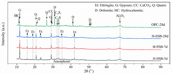The hydration products of the H-SSB and OPC were examined through XRD, and the results are stated in Figure 5. The main crystal hydration products of the H-SSB are ettringite and gypsum. Hydration of SS generates calcium hydroxide (CH). Then, the GGBFS, whose main composition is a solid solution of CaO-SiO2-Al2O3, can react with the CH to produce calcium silicate hydrate (C-S-H) and calcium aluminate hydrate (C-A-H). Further reactions between C-A-H and sulfate produce the ettringite. These main reactions in H-SSB are in accordance with the XRD results, where CH peaks are absent, and ettringite peaks are found in H-SSB. Comparatively, the hydration products in OPC have multiple crystal minerals such as gypsum, hydrocalumite, calcium carbonate, and dolomite. The clinker hydration produces a large quantity of C-S-H and CH. The presence of calcium carbonate comes from CH carbonation [42]; then, parts of the calcium ions can be replaced by magnesium ions precipitating dolomite.