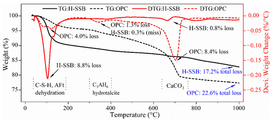 The TG/DTG curves of the H-SSB and OPC paste samples at 28-day curing.