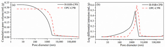 The MIP test results of the H-SSB and OPC CPB samples at 28-day curing: (a) cumulative pore volume distribution and (b) pore volume vs. pore size distribution.