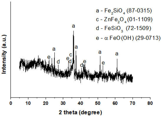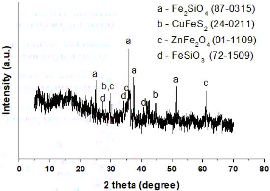 Fayalite (Fe2SiO4), ferrosilite (FeSiO3), zinc ferrite (ZnFe2O4) and chalcopyrite (CuFeS2) have been identified as crystalline phases in the initial sample according to XRD analysis (Figure 1). The very high background and weak intensities of the diffraction lines indicate that the slag contains a significant amount of amorphous material. Amorphous phase content is high in slags that have been cooled rapidly [46].