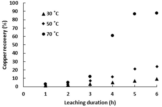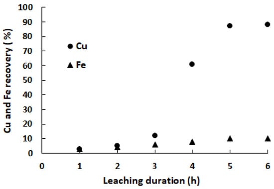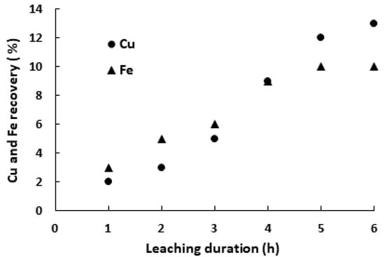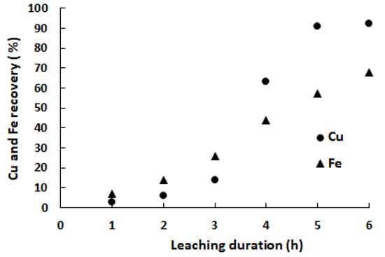 Both metals showed a general trend of increasing recovery after 5 h of leaching. However, the progression in the percentage of recovery for copper and iron was different. During the first three hours of leaching, the recovery of copper was only 14%, while in the next hour the recovery increased to 63%. The maximum extraction of copper reached 91% after 5 h of leaching and remained virtually unchanged during the next hour of slag contact with the solution. The achieved copper recovery was higher than that described by Solis-Marcial and Lapidus [44]; moreover, in our case, the pulp density was also higher.