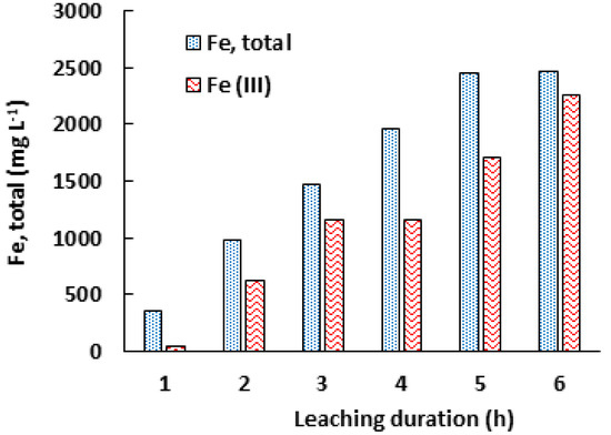 Under both conditions (presented in Figure 2 and Figure 3) recovery of copper into solution was relatively low in the first 3 h and increased sharply in the next hour of leaching. A possible reason was the accumulation of the leaching agent in solution (other than sulfuric acid and ozone) during the first hours of leaching and its subsequent interaction with the slag sample. Such a leaching agent could be Fe3+ ions. Figure 4 shows the change in the concentration of iron ions in the solution over time, including Fe3+ ions. At the end of the first hour of leaching, the total concentration of iron was 361 mg L−1, while in the next 3 h, the increase in iron concentration was about 490 mg L−1. The content of Fe3+ ions during the first hour was 41 mg L−1 with a sharp increase in the second and third hours of leaching (up to 627 and 1161 mg L−1, respectively). Between the third and fourth hours of leaching, the content of Fe3+ remained approximately at the same level, with an increase (by 550 mg L−1) in the fifth hour of leaching.