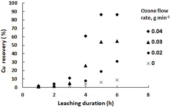 The next series of experiments was devoted to the study of ozone flow rate, up to its absence, for the extraction of copper into solution (Figure 5). The rest of the parameters were the same as in Figure 4.