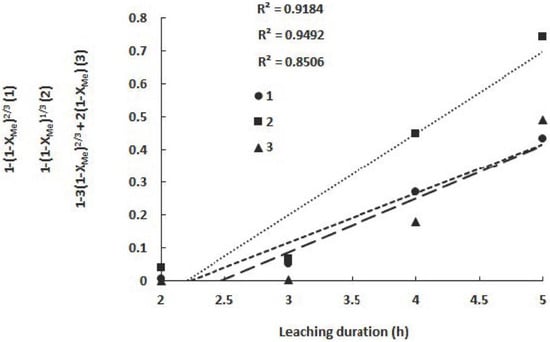 To reveal the actual rate-limiting step of the copper leaching process under study, the dependences of copper extraction on the leaching duration in accordance with models (12)–(14) were found (Figure 8). A three-hour leaching period (from the second to the fifth hour) was chosen, in which significant changes in the extraction of copper into solution were observed; copper recovery data was taken from Figure 7.