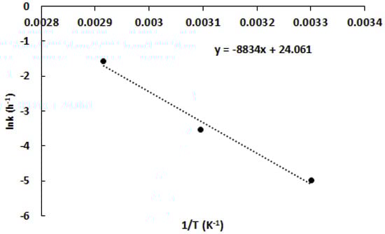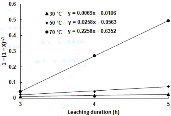 To calculate the apparent rate constant of chemical reaction, the data from Figure 9 were used in combination with Equation (13); the resulting plot of 1 − (1 − XMe)1/3 vs. leaching duration is presented in Figure 10. The chemical reaction rate constants (h−1) at indicated temperatures are: 0.0069 (30 °С), 0.0258 (50 °С), and 0.2258 (70 °С). Arrhenius plot for copper recovery from copper smelter slag was created by using these calculated rate constants (Figure 11). The linear fitting confirms that the copper recovery into the solution is controlled by the chemical reaction on the slag’s surface.