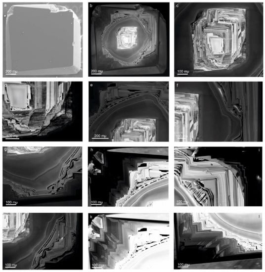 The rim consists of two subzones: a light inner subzone, and a dark outer one. Before the formation of the inner subzone, the cuboid apparently underwent minor dissolution, which produced pits on the surface of the cuboid zone (Figure 3f,j). Initially, this subzone has a jagged, micropyramidal character over the convex surface of the cuboid zone; the faces of the micropyramids correspond to an octahedron. In the outer subzone, growth had a columnar character. Above the vertices of the cuboid, growth continued with octahedral layers (Figure 3f,g). It is clearly seen that growth over the convex surface of the cuboid is the most rapid and blocky, while over the vertices of the cuboid, growth is slow and layered (Figure 3f,g). The convex cuboid surfaces were quickly overgrown with columns, while the vertices became slowly overgrown, layer by layer, and the crystal finally acquired an octahedral habit. After the formation of its inner subzone, the crystal underwent partial dissolution (Figure 3i), then octahedral growth resumed following the inherited columnar patterns, i.e., it was likewise columnar (Figure 3k,l). Eventually, the cuboid crystal transformed to a flat-faced octahedron.