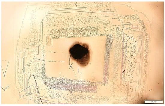 The core shows the most intricate pattern (Figure 3b–d) produced by unstable conditions during early crystal growth. Judging by the contours of the growth zones, the crystal was growing as an octahedron, but the growth layers shifted, one relative to another, while the nucleation center remained perfectly homogeneous. The inclusion of chromite is located in the center of the homogeneous zone, but is not expressed in any way in the cathodoluminescence pattern, as well as in the pattern of structural etching (Figure 4).