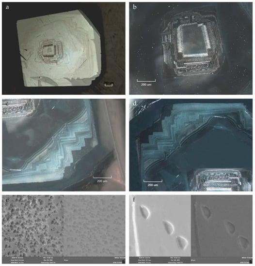 The image of the etched diamond plate (Figure 5) highlights the same zones as the CL image, with flat-bottomed center-ward pits on the crystal surface (Figure 4) that have symmetry corresponding to that of the growth sectors. In the absence of etch channels along dislocations, the pits most likely represent point defects, which are also responsible for the CL patterns, while the density of the pits corresponds to that of the defects. The density of the defects is greatest along the periphery of the core, while its center is almost free from defects, as in the CL image (Figure 4 and Figure 5a,b). Defects are few in the transition zone (corresponding to the cuboid growth), which is free from growth sectors or fibers, while growth zones appear only at the final stage (Figure 5c,d).