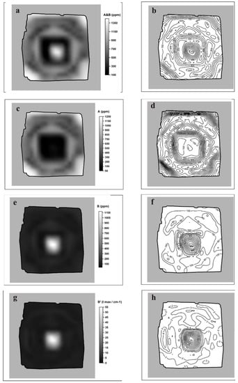 Results of IR mapping of diamond plate 4007. Spatial distributions are shown: (a,b): total nitrogen, calculated as the sum of concentrations A and B of nitrogen defects; (c,d): nitrogen in the A form; (e,f): nitrogen in the B form; (g,h): the intensity of the platelets peak B’.