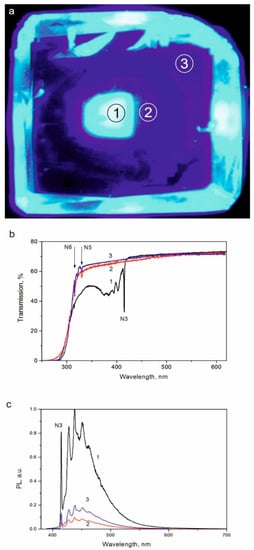 The transmission and photoluminescence (PL) spectra (Figure 7a) were measured in three zones: the strongly luminescent center of the core that grew by the octahedral mechanism (1); a weakly luminescent transition zone (2); and the rim (3), which was formed by cuboid and octahedral growth, respectively.