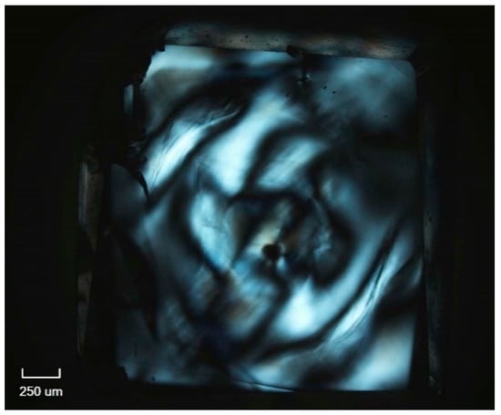 Diamond forms in the mantle at high pressures and temperatures. Decompression and quenching of the erupting kimberlite magma which carries diamond to the surface, as well as the presence of nitrogen defects, cause stress to the crystals. The stress appears as anomalous birefringence and is detectable in polarized light. Anomalous birefringence, as a reflection of structural inhomogeneity, has been studied for a long time [9,10,11,12,13,14,15]. Anomalous birefringence may result from: (1) impurities and defects in zones and sectors; (2) external forces, e.g., grain collisions and wear during formation of placers; (3) plastic deformation; and (4) inclusions [10]. The diamond plate we analyzed likewise shows anomalous birefringence associated with the distribution of defects (cause 1) in the core, transition zone, and rim, which were formed, by octahedral, cuboid, and octahedral growth, respectively (Figure 8). The chromite inclusion in the core center produces a local field of anomalous birefringence, associated with thermal expansion difference between diamond and chromite and the related stress (cause 4).