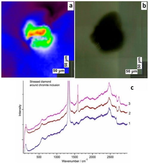 Raman spectroscopy also shows signs of mechanical stress [36,37,38,39], in this case around the inclusion of chromite. The diamond stress field around the inclusion comprises radial and azimuthal components, the former being more prominent than the latter (Figure 9a). Strong azimuthal stress may be associated with the non-spherical shape of the inclusion, which induces anisotropic stress at corners, as well as with difference in compressibility along (111) and (001) axes, with shifts of 2.2 cm−1/GPa and 0.7 cm−1/GPa, respectively [37]. The azimuthal stress may be due to non-orthogonality of the two directions (Figure 9a). Additional complex mechanic stress may arise around cracks in diamond. The interior pressure in the chromite inclusion was estimated as ~0.8 GPa.