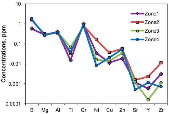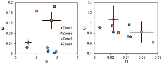 The concentrations of selected, detectable impurity elements were analyzed in four growth zones (1–4) of the diamond plate, numbered from core to rim, in individual spots, and as average over the zones (Table 1). Concentrations are the highest for B and Cr: 0.5–1.75 ppm and 0.7 to 1 ppm, respectively, while Sr, Y, and Zr, are very low (0.5 to 31 ppb). The growth zones differ in composition (Table 1; Figure 10 and Figure 11), with the highest Cr and lowest B and Ti in the core (zone 1); Ni, Cu, Mg, Y, and Zr enrichment, and Al depletion, relative to other zones in Zone 2; highest Ti and lowest Cr contents in Zone 3; low Ni in Zone 4, where Ti and Cr contents are comparable to those in Zone 2, while Mg and Al contents are about the same as those of Zone 3. Averaged totals of all selected elements are lowest in the core (2.3 ppm), and 3.26–3.32 ppm in all other zones. The contents of B and Ni (Figure 10) plot different fields for zones 1 and 2, but overlap for zones 3 and 4 (Figure 10). Ti and Cr (Figure 10) of zones 1 and 3 are in negative correlation, while those of zones 2 and 4 occupy an intermediate position.