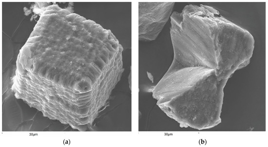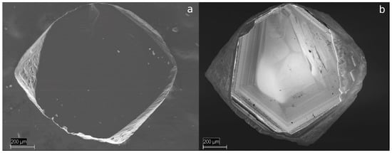 If the growth of a diamond stopped at a cuboid, then we would have a “coated diamond”. However, the period of growth along the cube was replaced by growth along the octahedron, which again indicates a change in the conditions of crystallization. Moreover, the surface of the cuboid was apparently subjected to slight dissolution, which can be seen from the etching pits crossing the outer thin contours of the growth layers along the cuboid surfaces (Figure 3 and Figure 5).