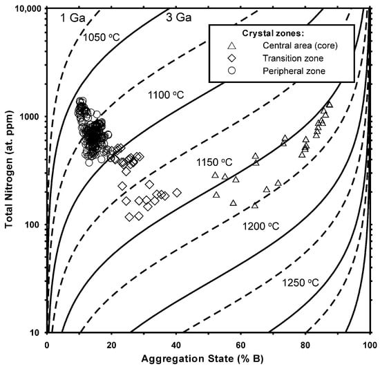 Plot of the degree of nitrogen aggregation (% B) in diamond 4007 versus its total nitrogen content, with added grid of isotherms of mantle residence for 1 and 3 Ga (calculated using 2nd order kinetic equation and nitrogen aggregation parameters from [41]). The central area of the crystal is “regular”, nitrogen aggregation varies from 50% and above, the points are located in the isotherm range 1140–1200 °C. Transition zone of the crystal show deviations from “regularity” with a shift of points towards lower temperatures, nitrogen aggregation decreases to 20%. The peripheral part of the crystal is “subregular”, nitrogen aggregation is 10%–20%, the points are localized in the region of isotherms with temperatures of 1060–1125 °C.