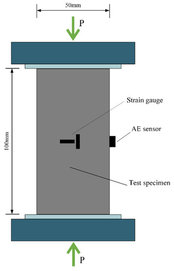 An MTS-816 electrohydraulic servomechanical test system was employed to carry out the uniaxial compression tests, with the loading rate set to 0.1 mm/min. Vaseline was applied to both ends of the specimens to eliminate the influence of end face constraints. A Micro-II AE acquisition system was used to monitor AE signals (seen in Figure 1), and the AE parameters were acquired by the AE sensor affixed on the surface of the specimens. A DH3816N static strain collection system was used to acquire strain data, as shown in Figure 2.