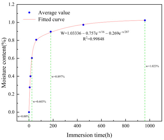 The relationship between the average moisture content and the immersion time obtained in the tests revealed the relationship of the sample moisture content with the immersion time, which could be fitted using Equation (1).
