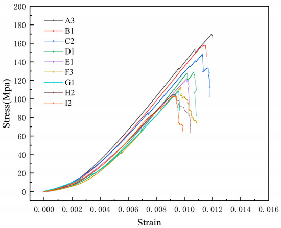 The results of the uniaxial compression tests are listed in Table 3. As shown in Figure 4, the peak stress gradually declined with the increase in moisture content. The stress–strain curves of all specimens showed a concave upward trend in the initial loading stage, which was mainly due to the nonlinear deformation caused by the crack closure in the rock specimens. With the increase in load, the stress–strain curves showed an approximately linear growth, with a lower moisture content resulting in a higher growth rate. With continued loading, the stress–strain curve reached the peak stress after going through a downward concave section. In addition, both the peak stress and the corresponding strain gradually decreased as the moisture content increased.