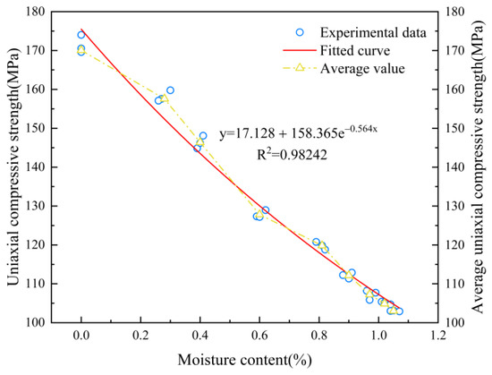 where y is the uniaxial compressive strength, and x denotes the moisture content. The correlation coefficient of the fitted function was R2 = 0.98242.