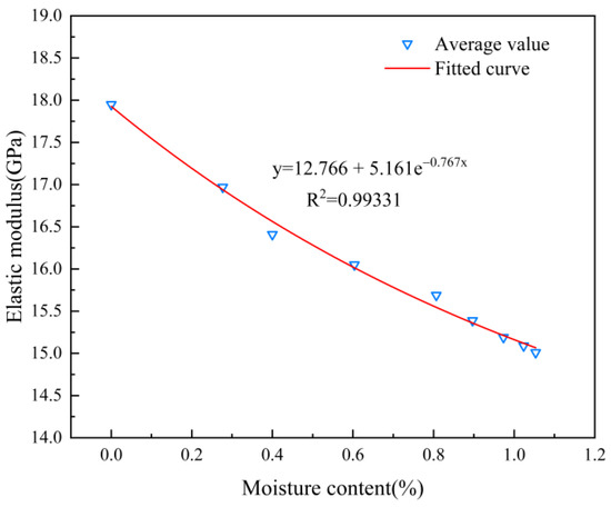 As shown in Figure 6, the average elastic modulus showed a downward trend as the moisture content increased, but the decline rate of the elastic modulus gradually dropped. When the specimens were dry, the average value of elastic modulus was 17.95 GPa, whereas, when the specimen was saturated, the average value of elastic modulus decreased to 15.01 GPa, with a decrease of 16.38%. This demonstrated that water produced an obvious decrease in the elastic modulus of the tuff. The relationship between the average value of the elastic modulus and the moisture content could be fitted using Equation (3).
