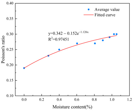 The Poisson’s ratio of the tuff specimens gradually increased with the increase in moisture content (Figure 7). The average Poisson’s ratio of the dry specimens was 0.19, whereas the average Poisson’s ratio of the saturated specimens was 0.30, showing an increase of 57.89%. The results proved that the increase in moisture content caused a large increase in the Poisson’s ratio of the tuff specimens. In addition, the Poisson’s ratio was more affected by moisture content than the elastic modulus. The relationship between the average Poisson’s ratio and the moisture content could be fitted using Equation (4).