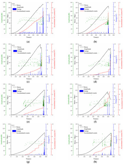 The AE signals began to accumulate after the “quiet period”. The AE counts basically rose steadily according to a certain slope before the peak stress, and the AE energy was also collected with the generation of AE events. However, both the growth rate of accumulated AE counts and the AE energy value were kept at a low level. When the stress reached the peak value, the accumulated AE counts and energy showed a very significant increase, which indicated that a large number of fracture events with high energy release occurred in the specimens when destroyed.
