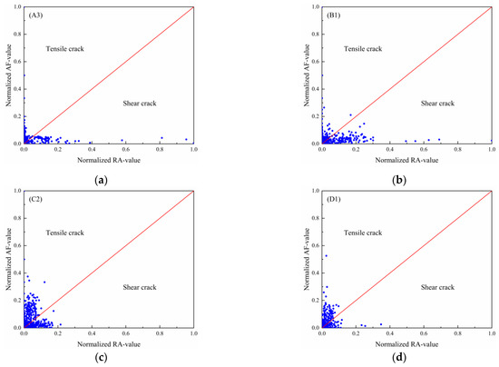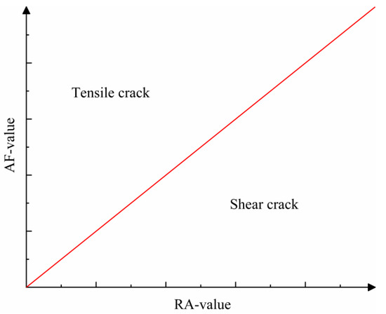 The RA–AF distribution analysis was implemented in a rectangular coordinate system with RA value as the horizontal axis and AF value as the vertical axis. During the uniaxial compression tests, a lower RA value and a higher AF value are generated when tensile cracks occurred. In contrast, the generation of shear cracks results in a higher RA value and a lower AF value. A diagonal line was used to divide the rectangular coordinate system into a tensile crack region and a shear crack region, as shown in Figure 9.