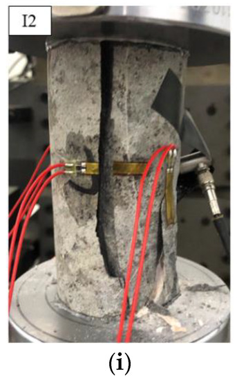 The failure patterns of the tuff specimens after the tests are shown in Figure 11. The failure characteristics demonstrated that the crack types were mainly diagonal shear cracks when the moisture content of the specimens was low. The failure pattern was mainly manifested as shear slip along the oblique cracks, as shown in Figure 11a–c. During the process of increasing moisture content, the type of cracks gradually changed from shear cracks along the diagonal to tensile cracks along the longitudinal. As shown in Figure 11h,i, the cracks produced were mainly tensile cracks when the specimens failed under high moisture content, and the failure pattern was mainly manifested as splitting tensile failure. In addition, through the comparison of the test results, it was found that the tuff specimens had a higher level of fragmentation under high moisture content, and more fragments were produced when they were broken.