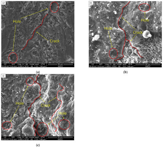 The damaged samples with 0% (A3), 0.62% (D1), and 1.04% (I2) moisture content were selected for SEM detection of the fracture surface, and the magnification was 2000×. As shown in Figure 12a–c, when the sample was dry, the failure section was relatively neat, and there were fewer fractures of holes and step zones. With the increase in moisture content, the failure mode tended to be complex, and the failure degree was higher, with more holes and cracks appearing. In addition, a higher moisture content led to more step zone cracks.